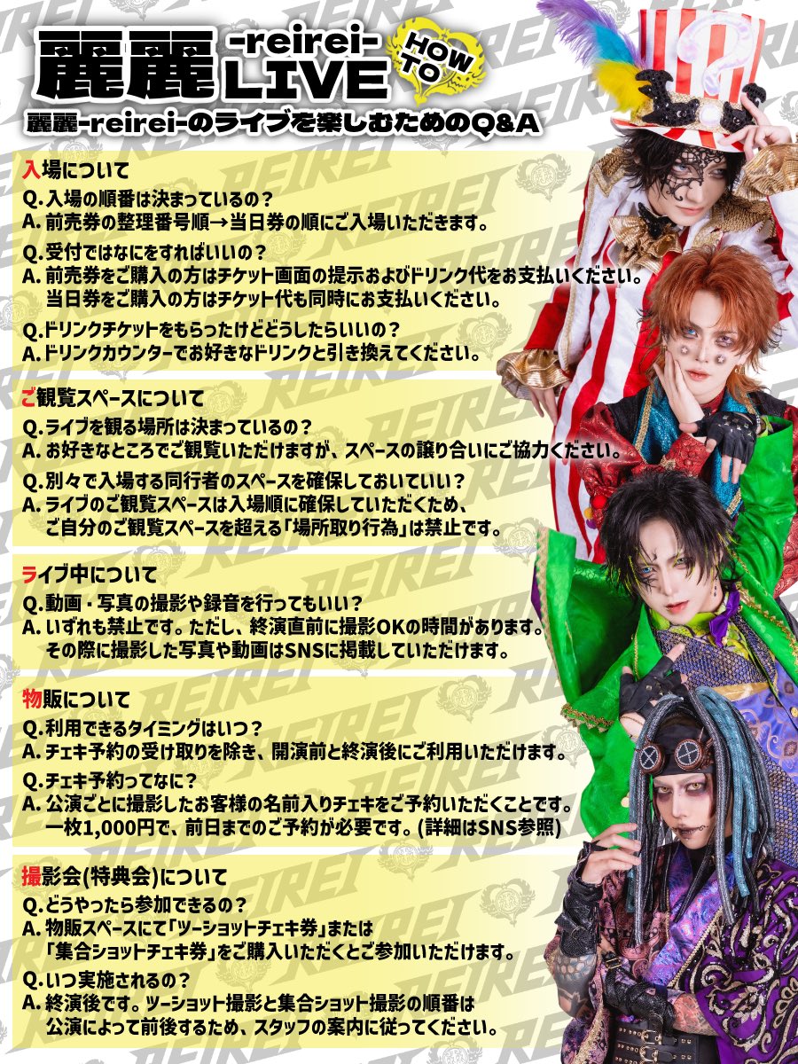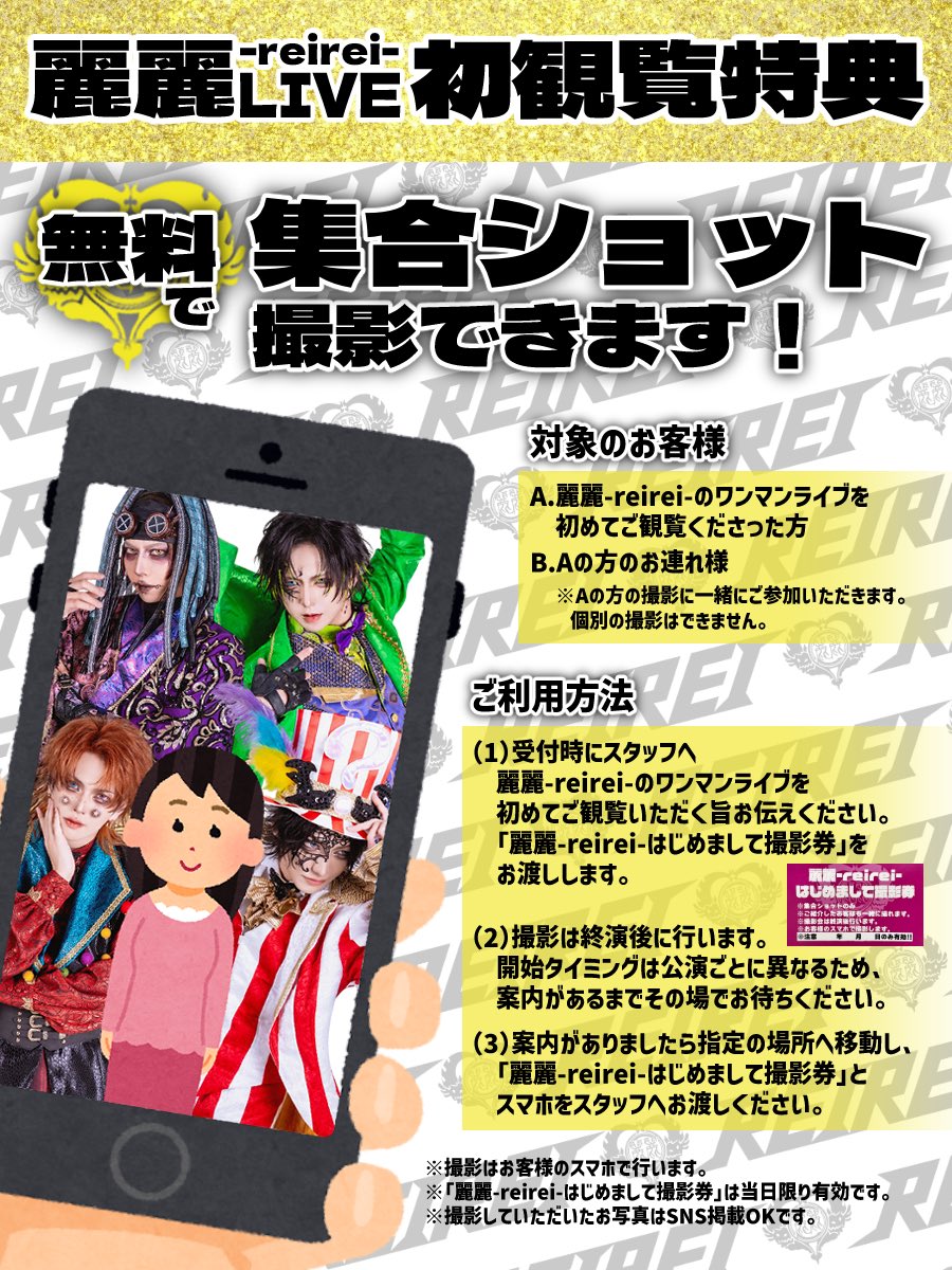 (1)受付時にスタッフへ、麗麗-reirei-のワンマンライブを初めてご観覧いたたく旨お伝えください。「麗麗-reirei-はじめまして撮影券」をお渡しします。